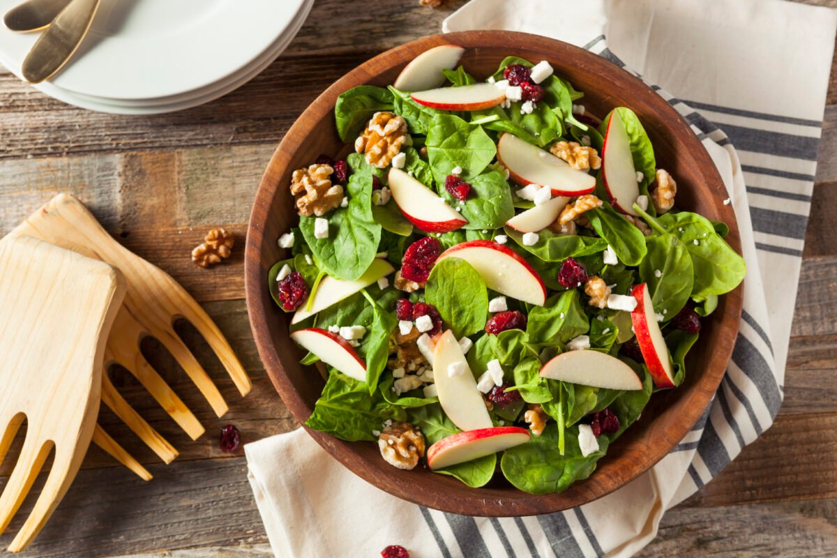 Spinach is known for its high nutritional value and is often included in healthy diets. When paired with apples, nuts, and a light dressing, it becomes a delicious salad that can be enjoyed as a meal or a healthy side dish.